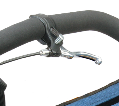 The running brake can be useful to slow down the buggy if you are moving at speed or help maintain control on a steep slope. IMPORTANT There is minimal weight over the front wheel. If the brake is used when on a slippery surface - e.g. wet or ice, dirt ground, grass, gravel etc. then the front wheel may lock but not slow the buggy's forward momentum as it slides along. Note recent models do not have the lever locking mechanism shown in the image above. |